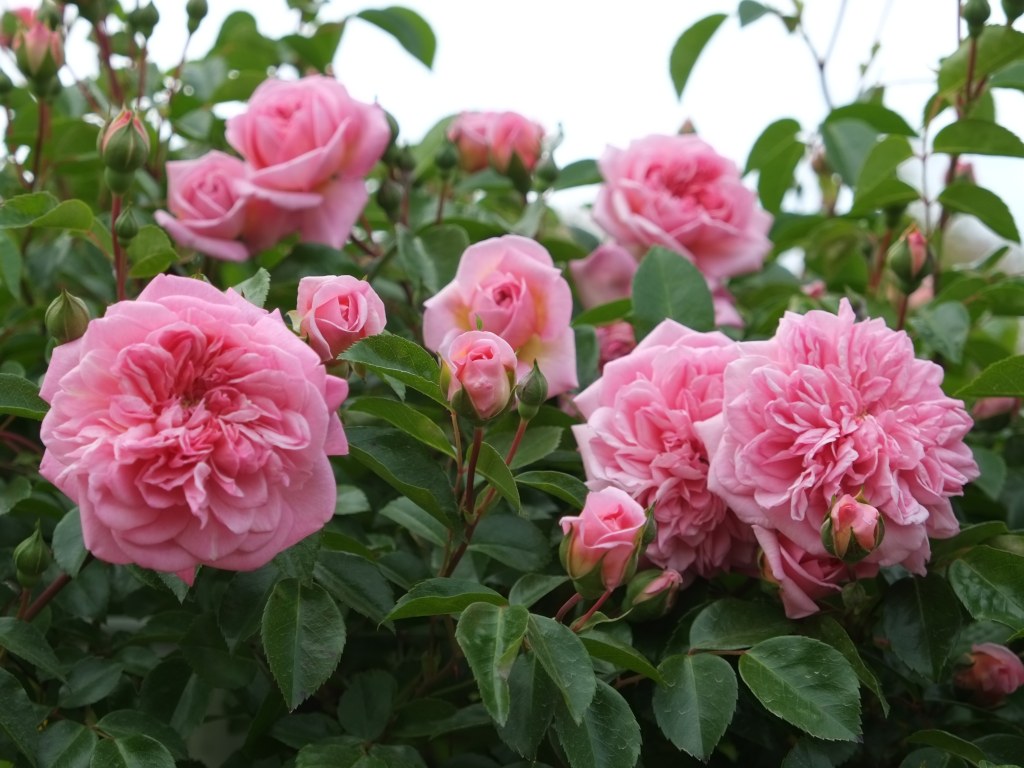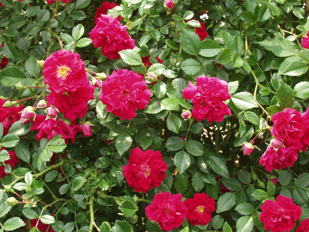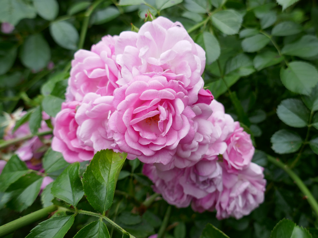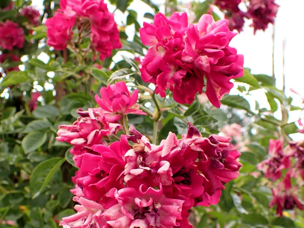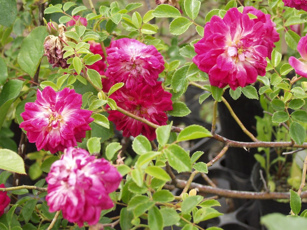 それゆえでしょうか、ふたつの品種は花色に違いがあるだけで葉形も樹形もよく似ていて、実際このエクセルサはレッド・ドロシー・パーキンスという別名でも流通しています。