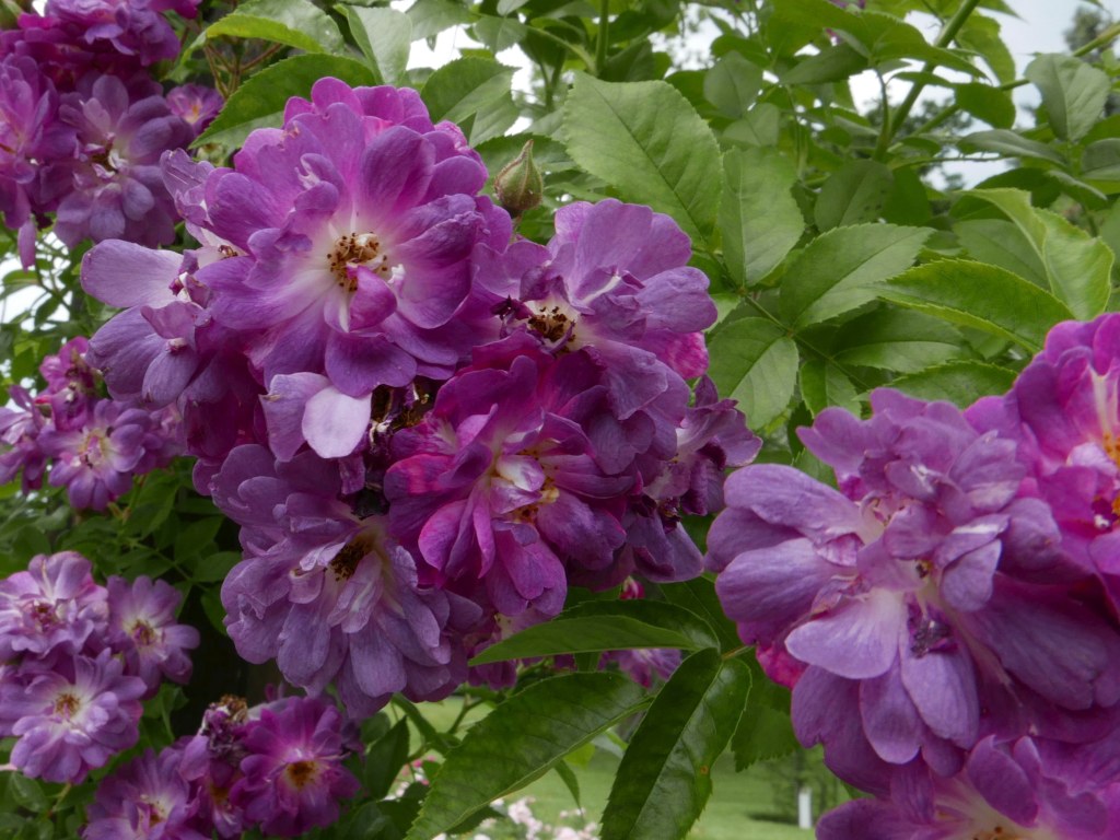 種親はハンガリーのゲシュヴントが育種した、パープルのハイブリッド・パーペチュアル、エリンネルング・アン・ブロッド(Erinnerung an Brod)、花粉親にはウィックラーナ・ルブラ(Wichrana Rubra)が用いられたというのが通説です。ここでも、その説にしたがいましたが、ウィックラーナの特徴である照り葉ではあるけれど、幅狭で、明るい色調の葉の様子からはウィックラーナではなくノイバラの影響を強く感じさせるなど、ウィックラーナ交配種とするには疑問を呈する向きもあるようです。