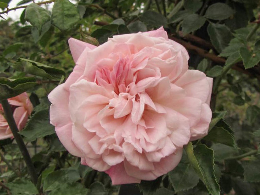 鋭いトゲと野趣に満ちた枝ぶりが特徴ですが、「どんな庭にも似合う…」(”Graham Stuart Thomas Rose Book”)など、華やかな開花の様子が多くのバラ研究家の賛辞を集めています。