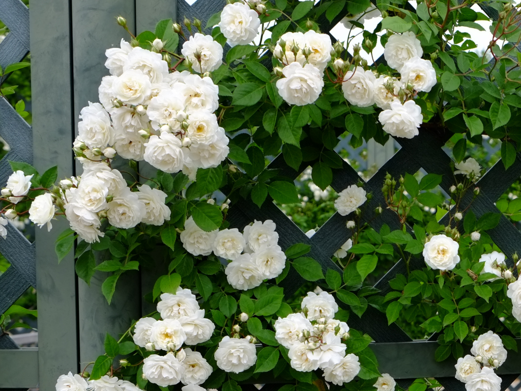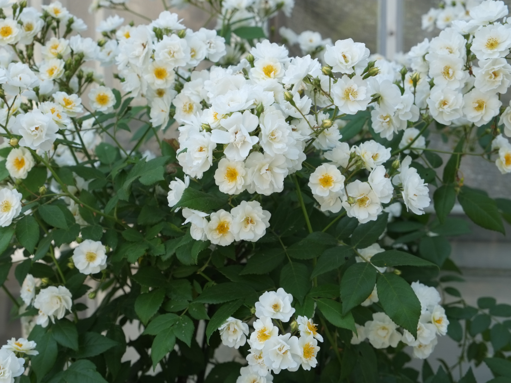 灰色がかった緑のつや消し葉と白花とのコントラストは、清楚でありながら、同時に妖しいほど魅惑的です。開花の最盛期に出会うことができれば、白花ランブラーの美しさの極みを満喫する喜びを感じることができるでしょう。