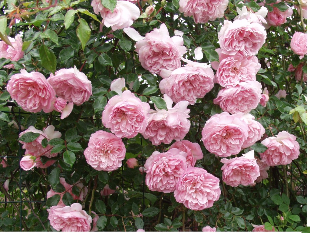 幅狭の深い色合いのつや消し葉、細めの枝ぶり、500cm高さ以上になるランブラーです。淡いピンクに花開くランブラーとしてこよなく愛されている品種です。
