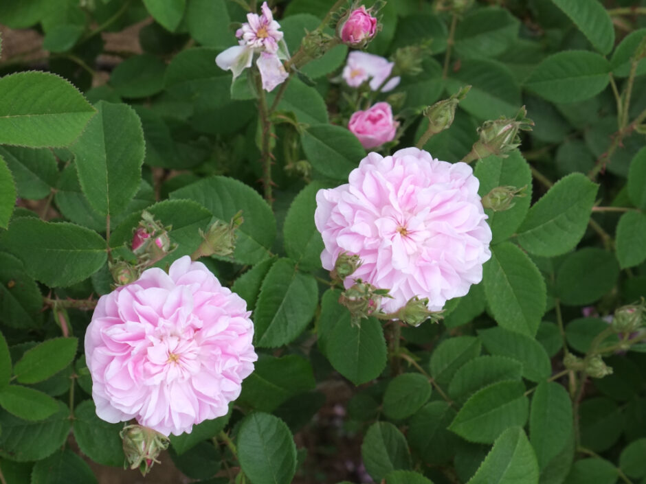 明るい色合いのつや消し葉。150cmから200cm高さにたっする比較的大型のシュラブとなります。