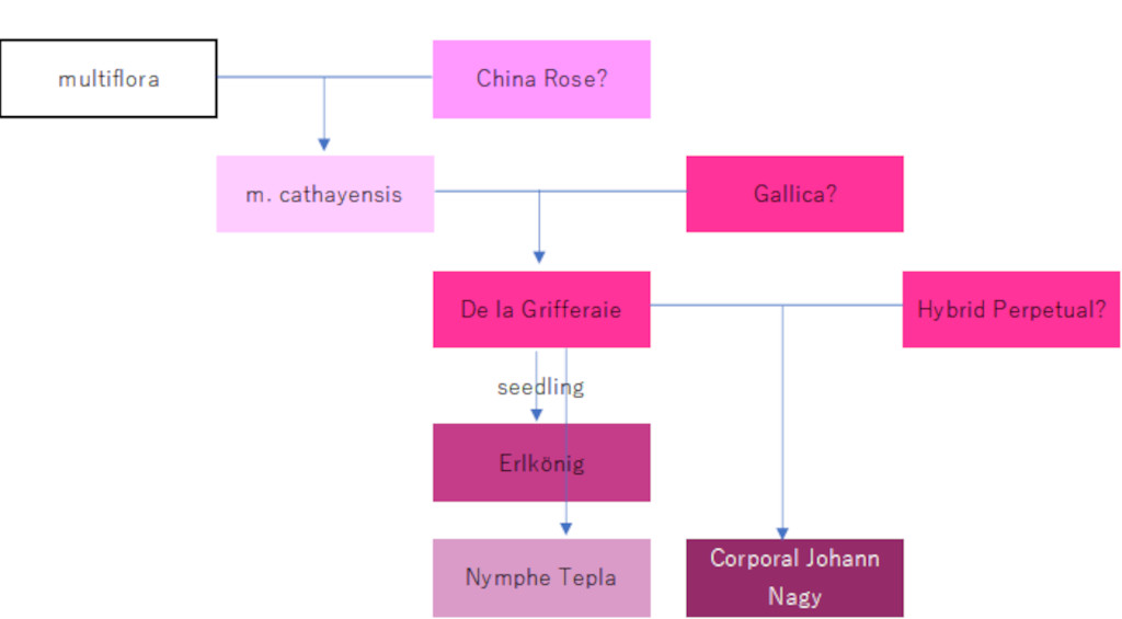 異彩を放つハンガリーの育種家ゲシュヴィントが耐寒性のある品種育種をめざしてさかんに利用したことでも知られていますが、ゲシュヴィントがめざしたのは大輪、深いピンク、紫などの濃色のシュラブやクライマーの育種でした。